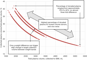 Given the advent of reliable plasma collection system technology with programmable software that reduces, if not eliminates, human error, new and more personalized nomograms are now possible again. Indeed, a continuous nomogram for plasma collection, integrating the weight, height, and hematocrit of the donor was recently tested in a randomized controlled trial (RCT) of over 3,000 source plasma donors and over 23,000 plasma collections. The technology-enabled software uses a nomogram that calculates the estimated total plasma volume of the donor on the day of the donation and applies a consistent 28.5% of estimated total plasma volume as target to all donors, with a cap of 1,000 mL for the maximum plasma collection volume. This RCT, the IMPACT (IMproving PlasmA CollecTion) trial (NCT04320823), showed that the safety of this personalized nomogram was non-inferior to the 1992 nomogram, while collecting on average ~8% more plasma across the donor population. This volume increase was the result of the higher allowable maximum donation volume in the context of changed donor demographics. Important to note is that with this novel nomogram ~75% of donors were able to donate more, while ~25% were limited to donate less plasma than before (11).