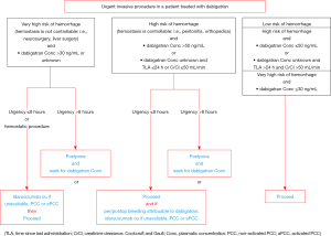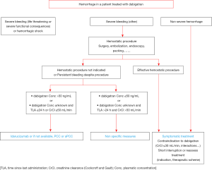- Albaladejo P, Pernod G, Godier A, et al. Management of bleeding and emergency invasive procedures in patients on dabigatran: updated guidelines from the French working group on perioperative haemostasis (GIHP). Anaesth Crit Care Pain Med 2018;37:391-9. [Crossref] [PubMed]