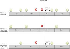 - Godier A, Dincq AS, Martin AC, et al. Predictors of pre-procedural concentrations of direct oral anticoagulants: a prospective multicenter study. Eur Heart J 2017;38:2431-9. [Crossref] [PubMed]