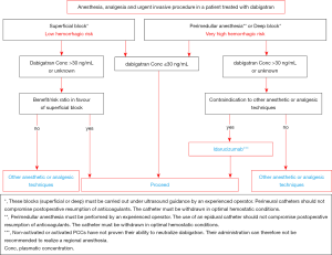 - Albaladejo P, Bonhomme F, Blais N, et al. Management of direct oral anticoagulants in patients undergoing elective surgeries and invasive procedures: updated guidelines from the French working group on perioperative haemostasis (GIHP). Anaesth Crit Care Pain Med 2017;36:73-6. [Crossref] [PubMed]