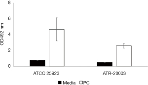 Quantification of S. aureus in the residual PC, performed in the Micro Lab, showed that the unit contained approximately 109 colony-forming units per millilitre (CFU/mL), a concentration that is clinically significant (16). The S. aureus strain isolated from the PC was assigned with the identification number ATR-20003 as per Canadian Blood Services standard procedures. Genomic DNA was extracted from this isolate and assayed for the presence of 21 superantigen enterotoxin genes by polymerase chain reaction (PCR) performed under the following optimized conditions: 30 s initial denaturation at 95 ℃; 30 cycles of denaturation (30 s at 95 ℃), annealing (1 min at 58 ℃), and extension (1 min at 68 ℃); a final extension at 68 ℃ for 5 mins (16). The primer sets that yielded amplicons are listed in Table 2. The results revealed that the genome of this new isolate encodes for five enterotoxins including SEs-G, M, N, O and SE-like U (Figure 1). The PCR amplicons were sequenced and the identity of the five genes encoding for these enterotoxins was confirmed. Importantly, enterotoxin SEG was detected by Western blotting in both, a culture supernatant of S. aureus ATR-20003 and a sample of the transfused PC (Figure 2). Since this isolate escaped detection during routine screening, its ability to form surface attached aggregates known as biofilms was assessed in PCs. A semi quantitative assay was performed as previously described (9) with a few modifications. Briefly, following the establishment of biofilms, the adherent cells were fixed with methanol (100% v/v) prior to staining with crystal violet. The results indicate that S. aureus ATR-20003 forms strong biofilms in PCs (Figure 3).